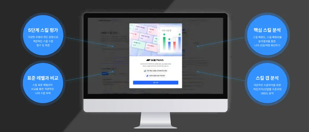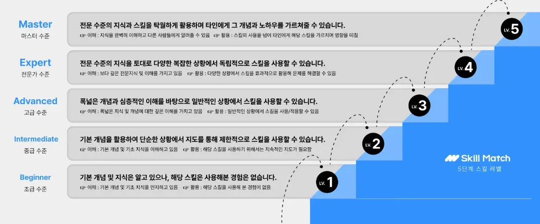 Skillmatch는 단순한 설문이 아닌, 직무 수행 능력을 기준으로 학습자의 실력을 1~5레벨로 세분화하여 진단합니다.